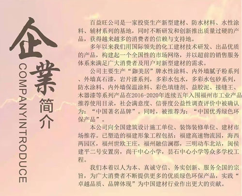 2、福州百益旺公司“鉫美居”天然真石漆采用硅丙乳液、純丙乳液, 高性能、高性價(jià)比,優(yōu)異的耐黃變性,耐候性好,耐久性